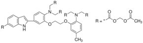 Cell permeable fluorescent probe for Ca2+; lower affinity than FURA 2; gives a large shift in fluorescent emission from 482 nm to 398 nm upon Ca2+ binding.