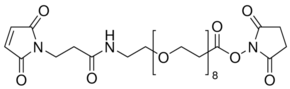 Heterobifunctional crosslinker with an ethylene oxide spacer for linking amine- to sulfhydryl-containing compounds or biomolecules. Maleimide functional group will react with sulfhydryls and the succinimidyl ester group will react with amines. Spacer length is 39.2 angstroms.